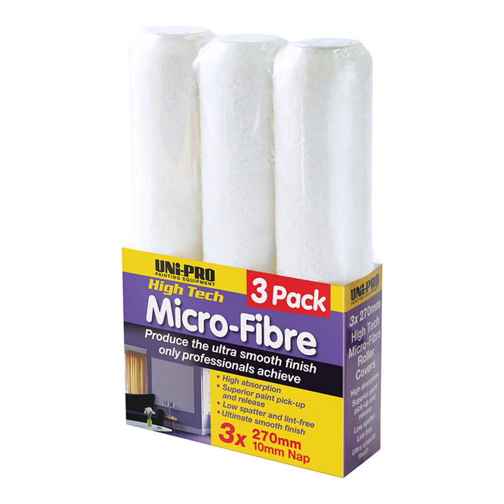 10mm Nap for a superior smooth gloss or satin finish, 270mm Micro-Fibre 3 pack. High absorption, superior paint pick-up and release, low spatter and lint-free, ultimate smooth finish.