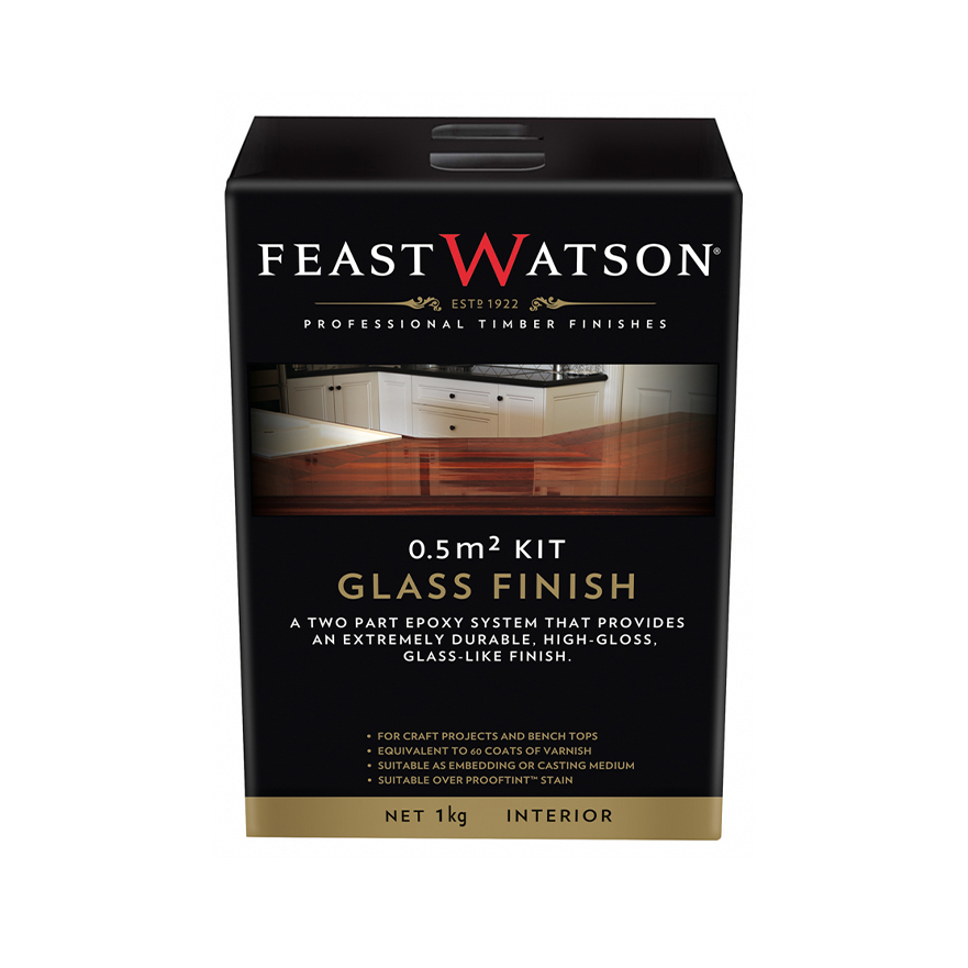 A two part, high build epoxy which provides an extremely durable, high-gloss, glass-like finish. Glass Finish is extremely tough, hard wearing, and scratch-resistant. A single application of Glass Finish is equivalent to 60 coats of traditional varnish. Glass Finish can be used on interior timber, and many other interior surfaces. It is ideal for small craft or decoupage projects, and highly recommended for interior timber benches and table tops. Glass Finish is suitable as an embedding or casting medium, and can be tinted to many colours with Prooftint Stain. Note: Glass Finish is NOT suitable for exterior timber, flooring or vertical surfaces.