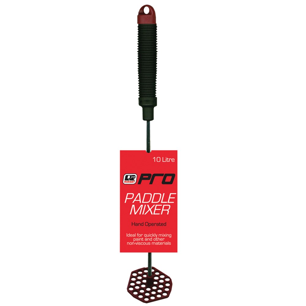 Pro Paddle Mixer 10 litre. Premium trade quality, plated steel shafts and tough nylon paddles.  Hand operated on the plunger principle. Ideal for quickly mixing paint and other non-viscous materials.