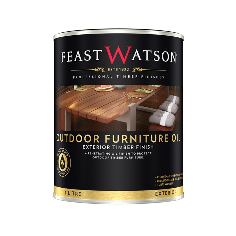 A protective, penetrating oil that has been formulated to preserve and maintain the natural beauty of outdoor timber furniture. Feast Watson Outdoor Furniture Oil penetrates deeply to enrich the timber with a natural matt finish that is available in clear or four tinted natural timber tones. With added eucalyptus oil, it has UV and mould resistant properties and has excellent water resistance. Outdoor Furniture Oil is available as a brush-on oil, or in a convenient spray.