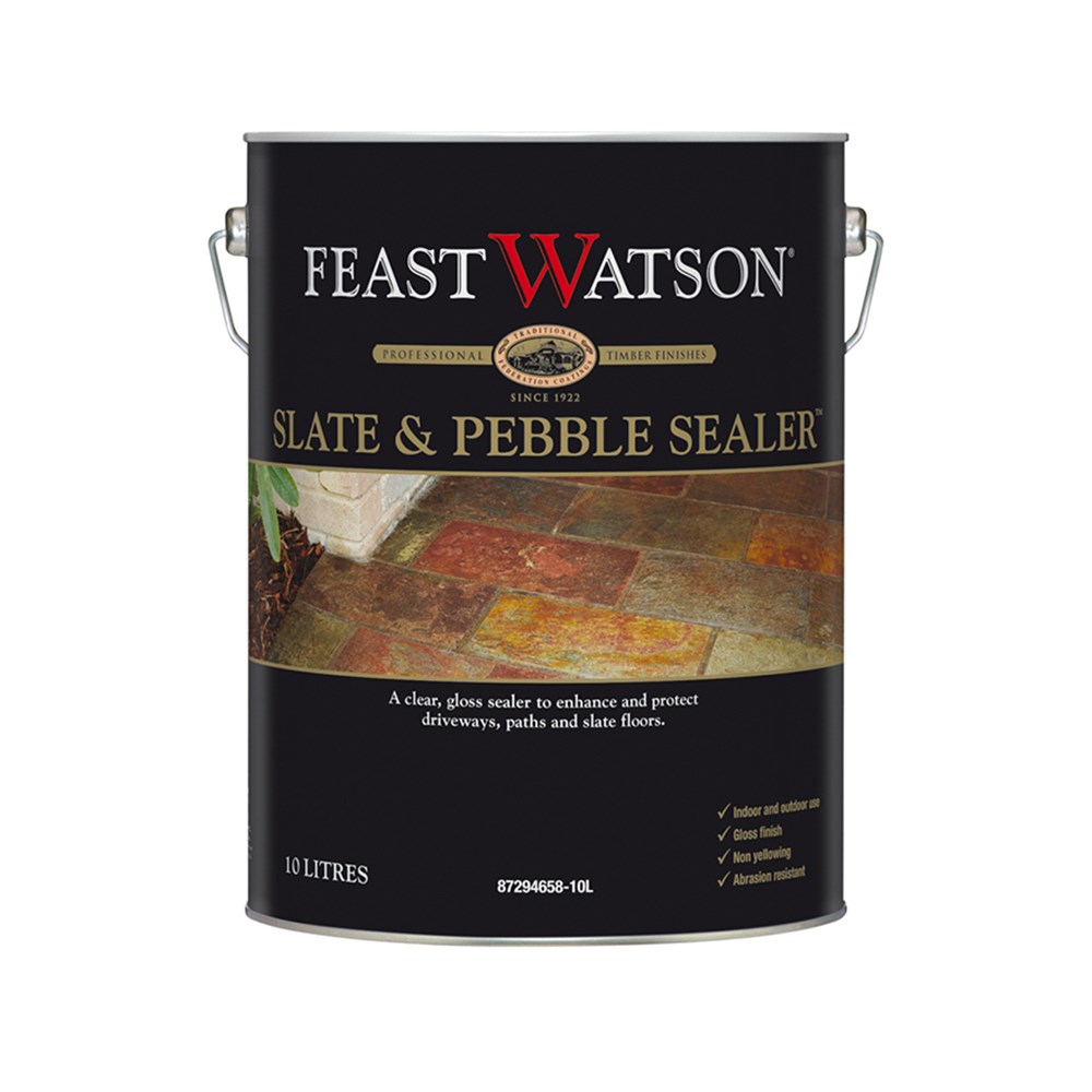 A tough, clear, sealer and top coat designed to protect non-porous stone surfaces from weather, abrasion, food, oil, grease and household dirt. Feast Watson Slate & Pebble Sealer brings out the full colour and natural beauty of slate and stacked stone with a gloss finish. Use on pathways, driveways, steps and front entrances. Ideal for enhancing pebbles in concrete and pebble aggregate. Slate & Pebble Sealer is easily recoatable and under normal conditions will not crack or peel. However, Slate & Pebble Sealer is NOT suitable for use on glazed or semi-glazed quarry tiles.