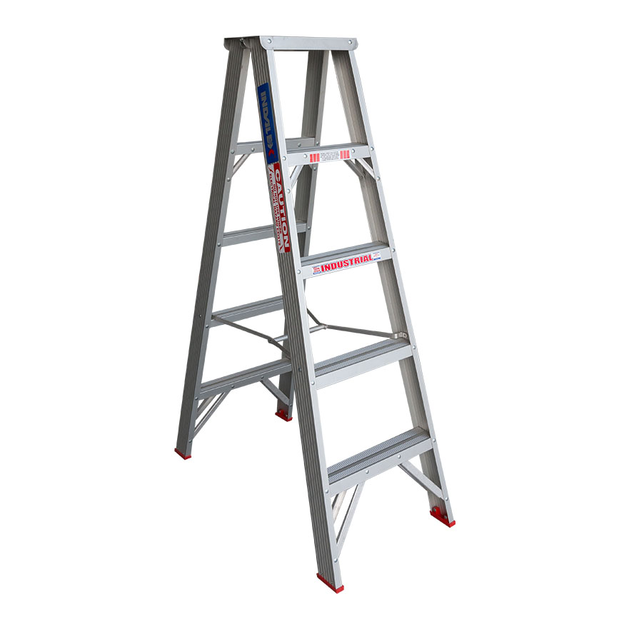 Durable lightweight design uses structural grade high tensile aluminium, to provide greater strength. All aluminium components have been anodized for better corrosion resistance and lower retention of dirt and grime. Diagonal locking designed spreader bar to allow for single handed deployment of the ladder. Anti slip moulded rubber feet for added safety. Double braced bottom steps for superior rigidity. Lightweight for easy movement and operation.