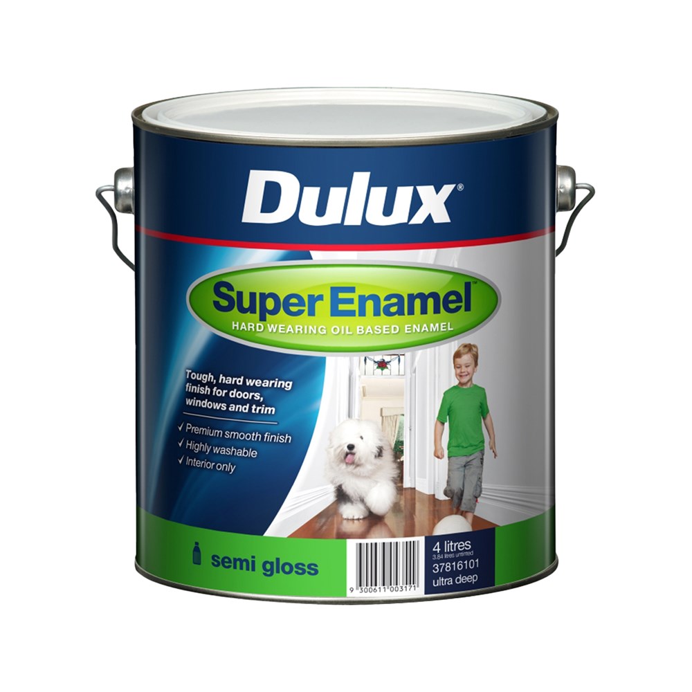 Dulux Super Enamel Semi Gloss is a high quality, hard wearing oil based interior semi gloss enamel for use on walls, doors, architraves and timber trim.