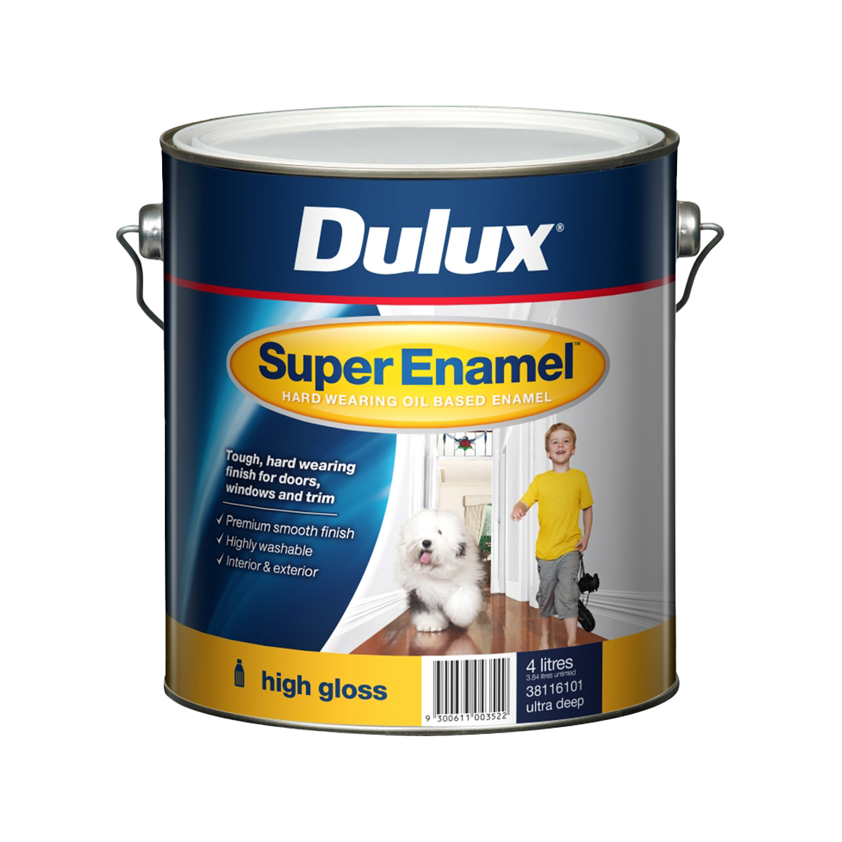 Dulux Super Enamel High Gloss is a high quality, hard wearing oil based interior gloss enamel for use on walls, doors, architraves and timber trim.