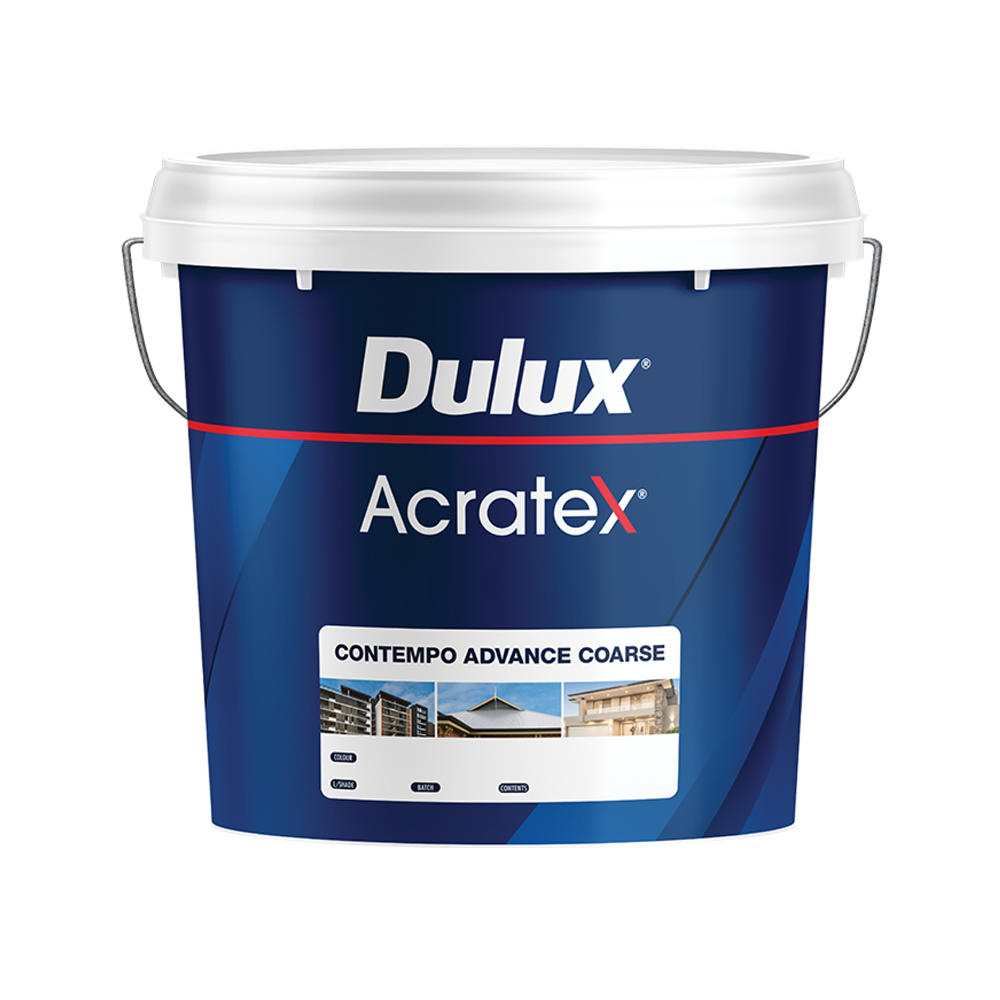 Dulux Acratex® Contempo Advance® Coarse is a modified acrylic 'bagging' product. It is a revolutionary new product featuring an anti wet Advance formulation that inhibits moisture passage and dirt pick up. Acratex® Contempo Advance® is an extremely tough acrylic high build coatings, especially formulated to produce a customised granular texture, near flat, appearance very much like that of a bagged finish render in two coats.