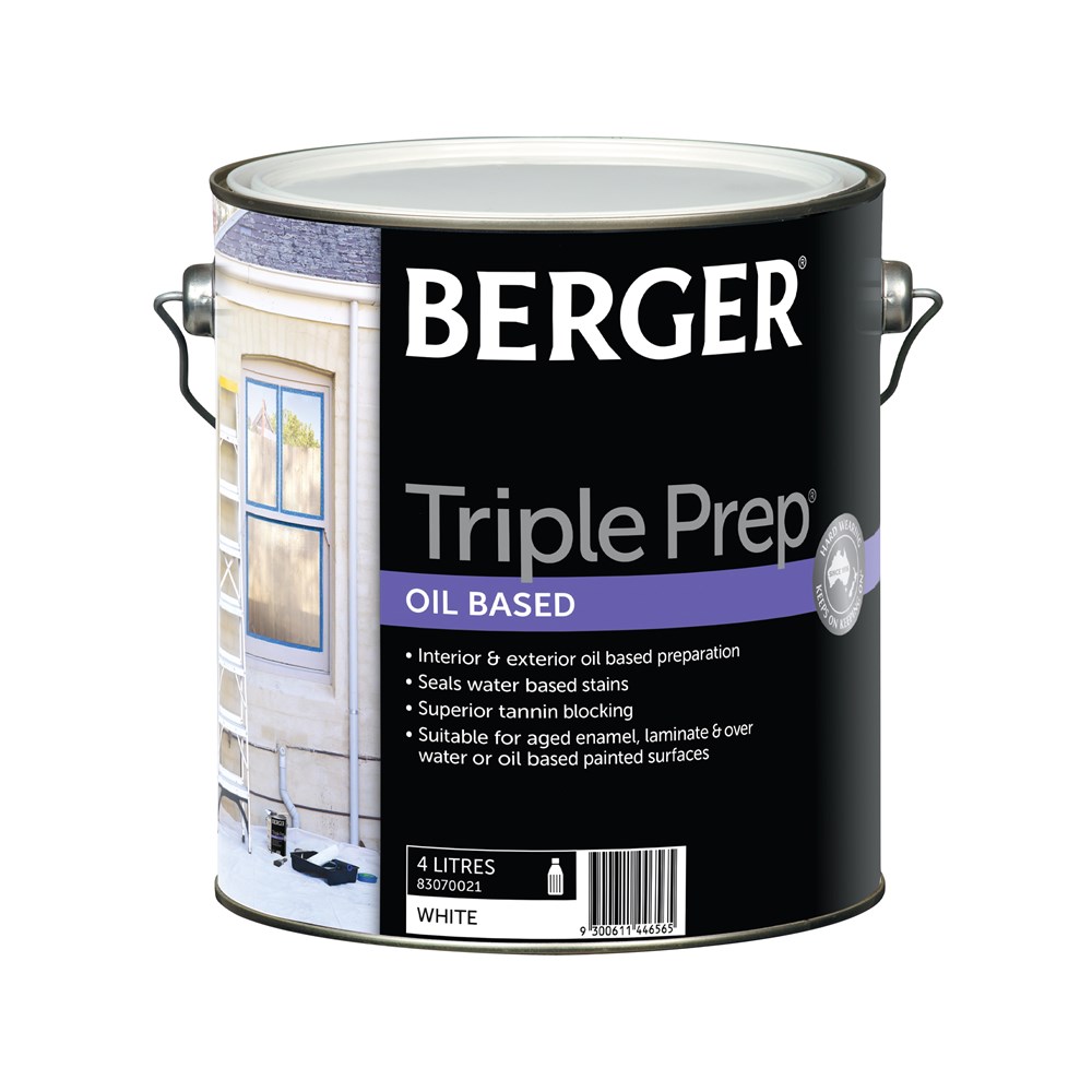 Berger Triple Prep Oil Based is a multipurpose preparation paint for use on interior and exterior surfaces to undercoat, prime and seal a surface. Berger Triple Prep Oil Based is ideal for use over aged enamels, laminates, and over pre-painted surfaces where a water or an oil based paint has been previously used. Berger Triple Prep Oil Based blocks water based stains, and has superior tannin blocking properties to prepare surfaces for painting.