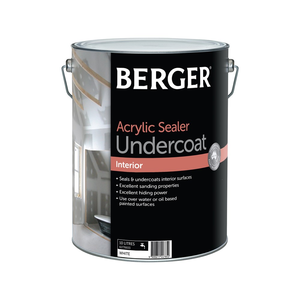 Berger Premium Acrylic Sealer Undercoat seals and undercoats interior surfaces and is easy to sand for a smooth finish. Berger Acrylic Sealer Undercoat has excellent hiding power to prepare the surface for painting with oil or water based top coats and is suitable for use over surfaces where a oil or water based paint has been previously used, following preparation instructions on pack.