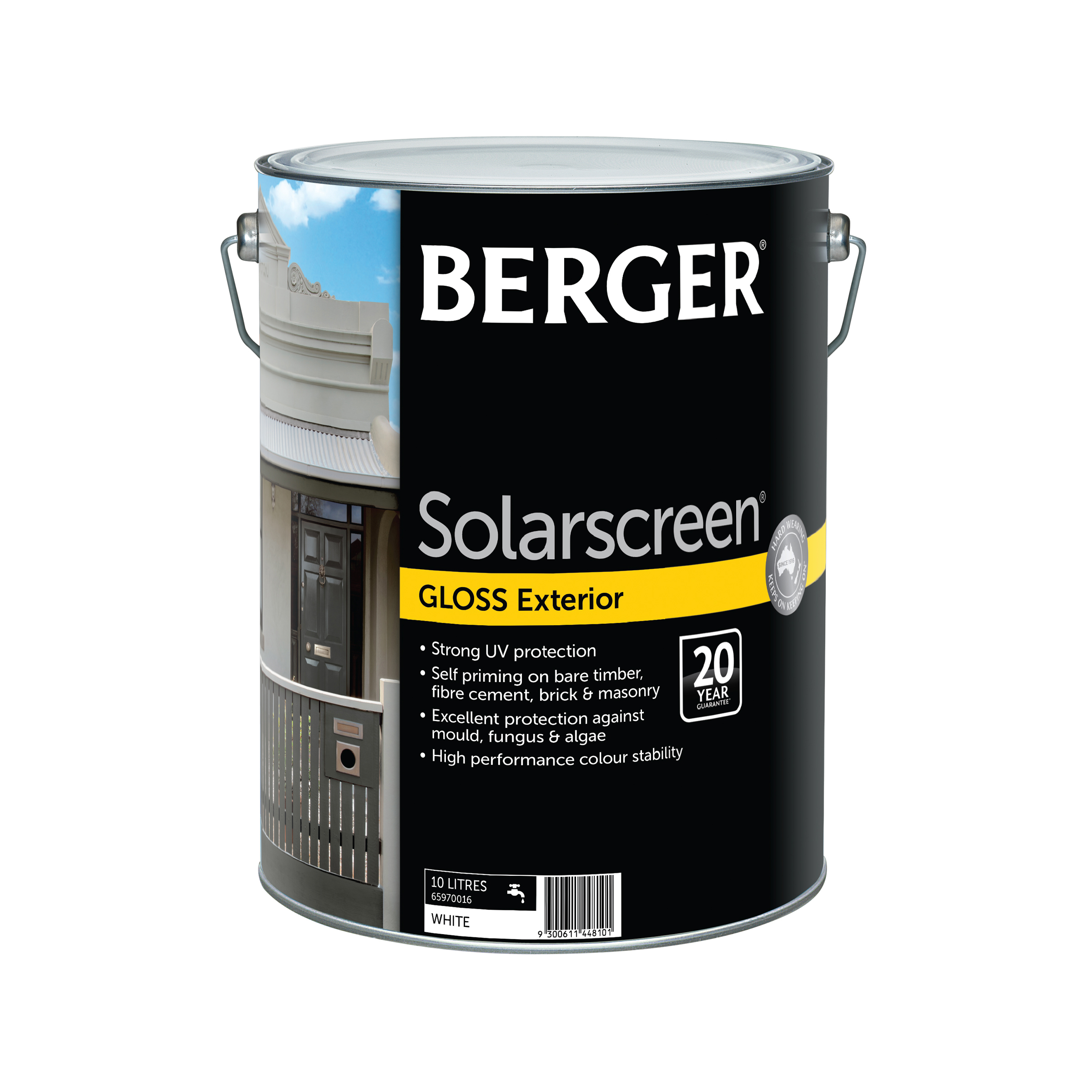 Berger Solarscreen is tested under our hot sun, to deliver strong UV protection backed by a 20 year guarantee against peeling, blistering and flaking. Self priming on bare timber, fibre cement, brick and masonry, Berger Solarscreen offers excellent protection against mould, fungus and algae. Berger Solarscreen has high performance colour stability, is hard wearing and designed to last.