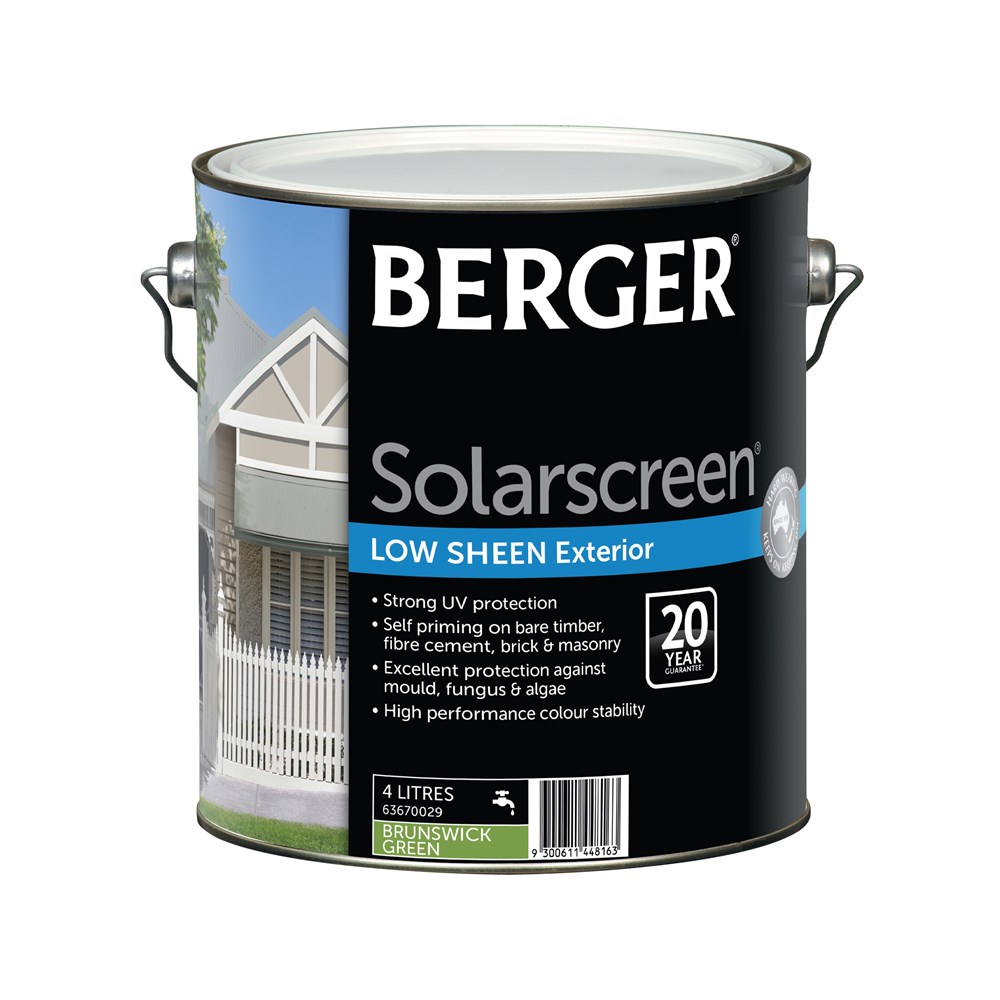 Berger Solarscreen is tested under our hot sun, to deliver strong UV protection backed by a 20 year guarantee against peeling, blistering and flaking. Self priming on bare timber, fibre cement, brick and masonry, Berger Solarscreen offers excellent protection against mould, fungus and algae. Berger Solarscreen has high performance colour stability, is hard wearing and designed to last.
