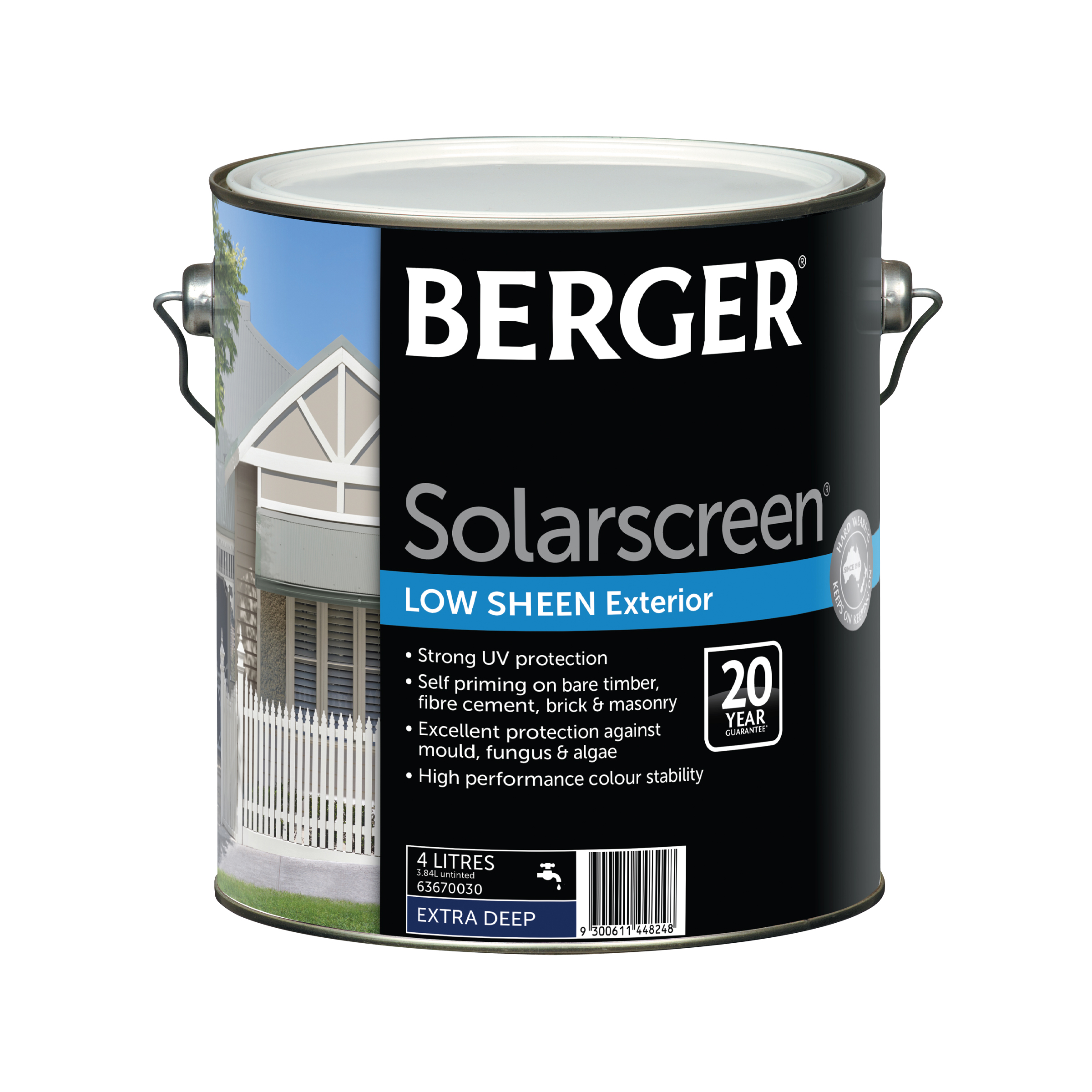 Berger Solarscreen is tested under our hot sun, to deliver strong UV protection backed by a 20 year guarantee against peeling, blistering and flaking. Self priming on bare timber, fibre cement, brick and masonry, Berger Solarscreen offers excellent protection against mould, fungus and algae. Berger Solarscreen has high performance colour stability, is hard wearing and designed to last.