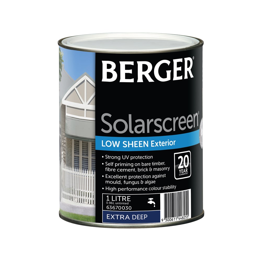 Berger Solarscreen is tested under our hot sun, to deliver strong UV protection backed by a 20 year guarantee against peeling, blistering and flaking. Self priming on bare timber, fibre cement, brick and masonry, Berger Solarscreen offers excellent protection against mould, fungus and algae. Berger Solarscreen has high performance colour stability, is hard wearing and designed to last.