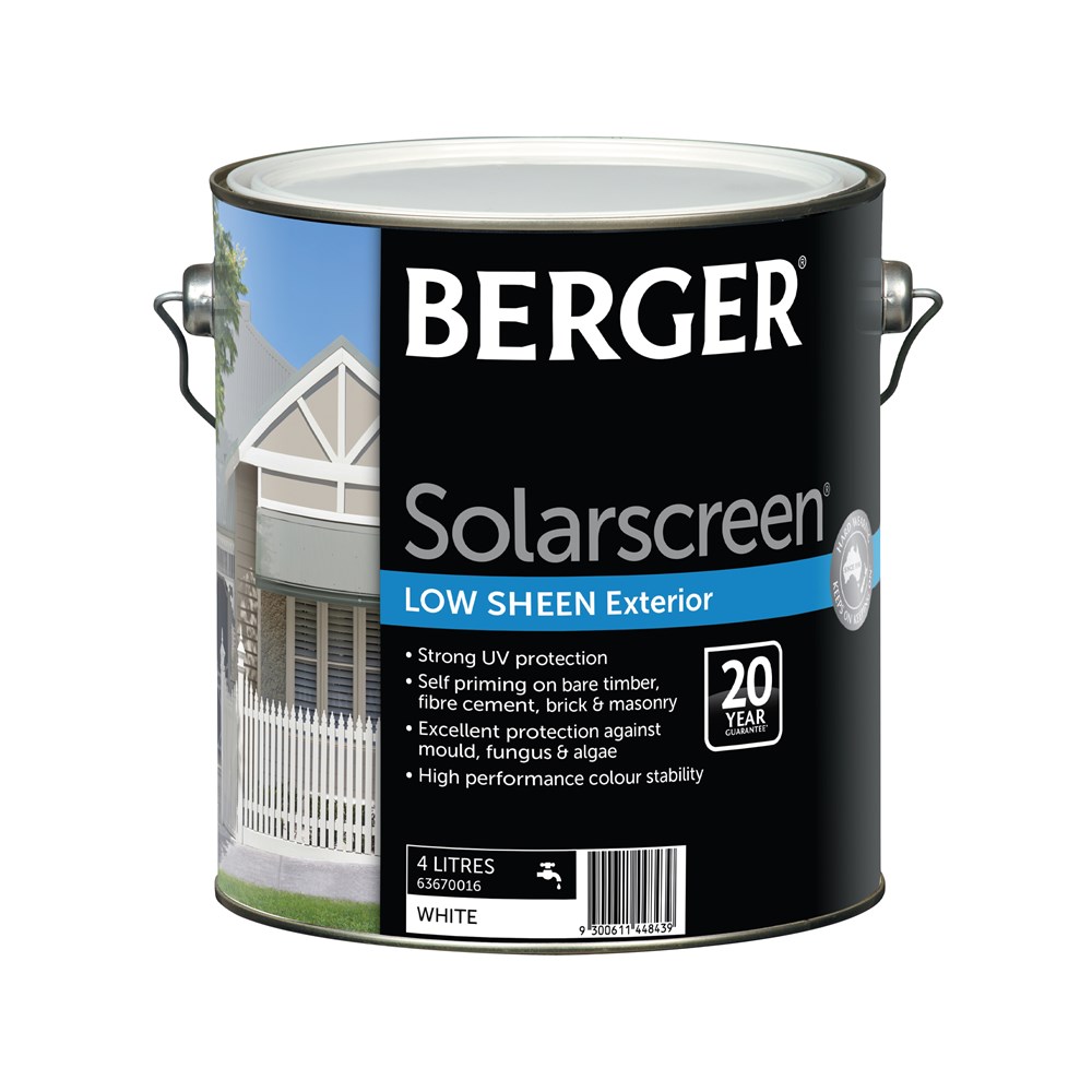 Berger Solarscreen is tested under our hot sun, to deliver strong UV protection backed by a 20 year guarantee against peeling, blistering and flaking. Self priming on bare timber, fibre cement, brick and masonry, Berger Solarscreen offers excellent protection against mould, fungus and algae. Berger Solarscreen has high performance colour stability, is hard wearing and designed to last.