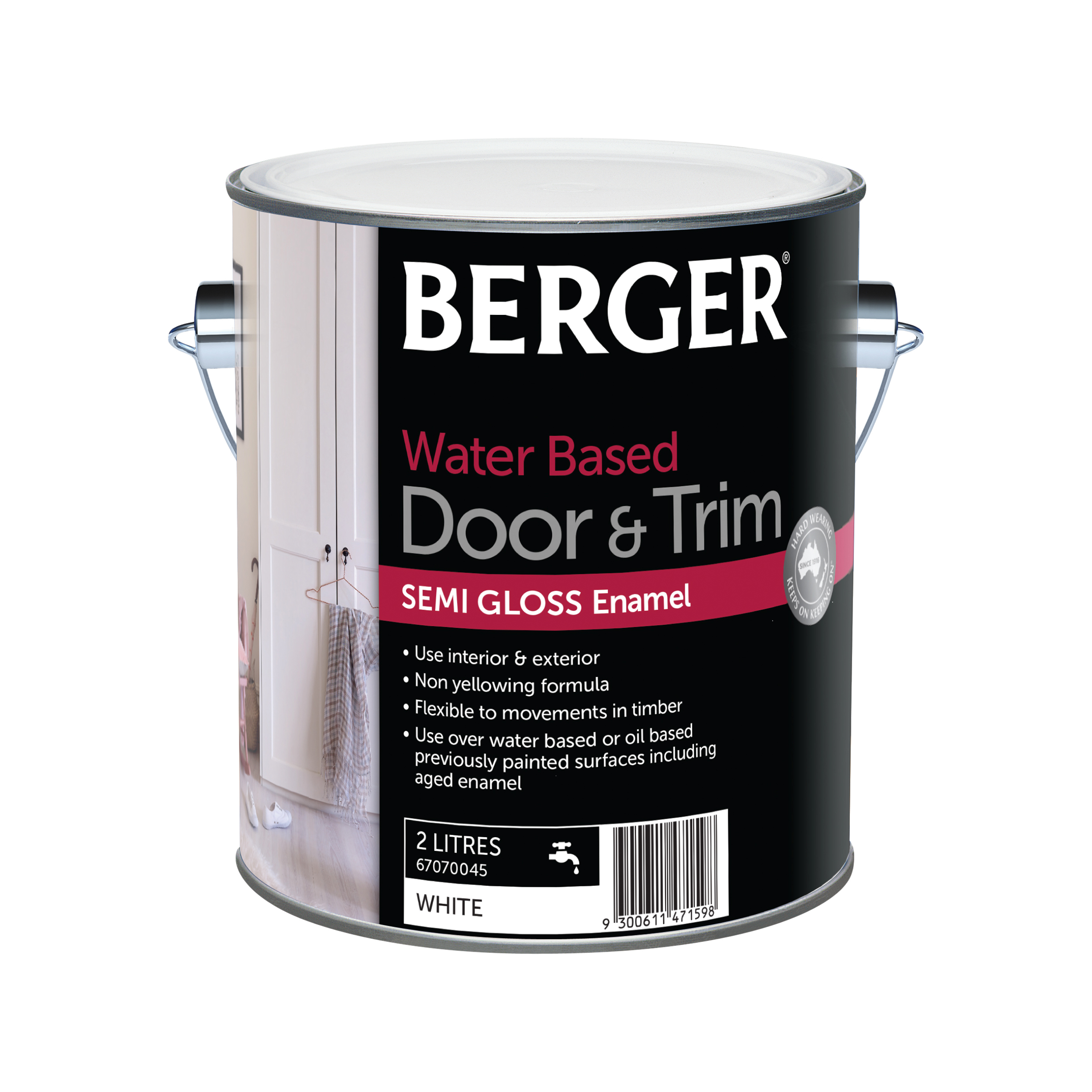 Berger Door & Trim Water Based creates a beautiful and hard wearing semi gloss finish ideal for doors, windows, and trim in your home. Berger Doors & Trim Water Based is non yellowing for better colour retention, and is flexible to movements in timber. Use Berger Doors & Trim in high traffic areas of your home.