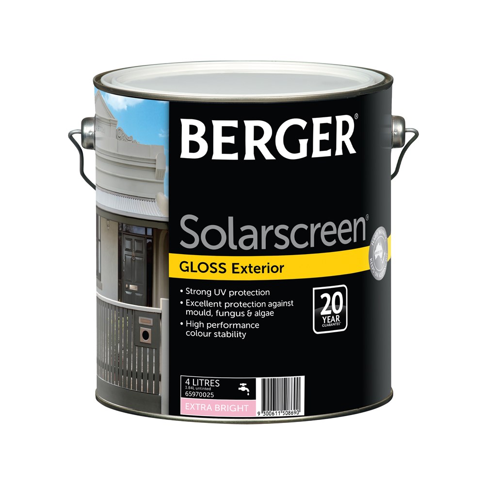 Berger Solarscreen is tested under our hot sun, to deliver strong UV protection backed by a 20 year guarantee against peeling, blistering and flaking. Self priming on bare timber, fibre cement, brick and masonry, Berger Solarscreen offers excellent protection against mould, fungus and algae. Berger Solarscreen has high performance colour stability, is hard wearing and designed to last.