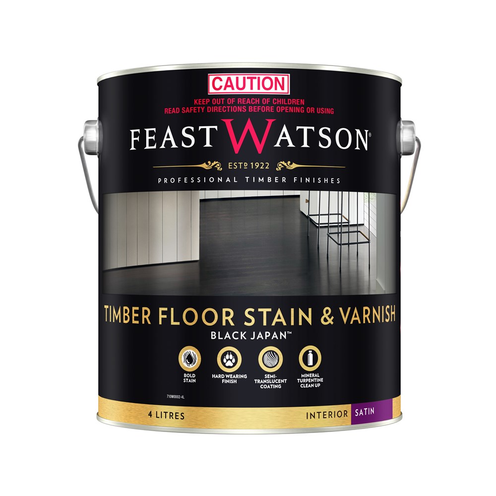 Feast Watson Timber Floor Stain & Varnish Black Japan is an oil based interior floor finish which combines a traditional Black Japan stain with a professional clear polyurethane for a one-step ‘Black Japan look’ and durable protection on interior timber and parquetry floors. The semi-transparent coating adds rich colour whilst allowing the grain pattern of timber to remain visible.