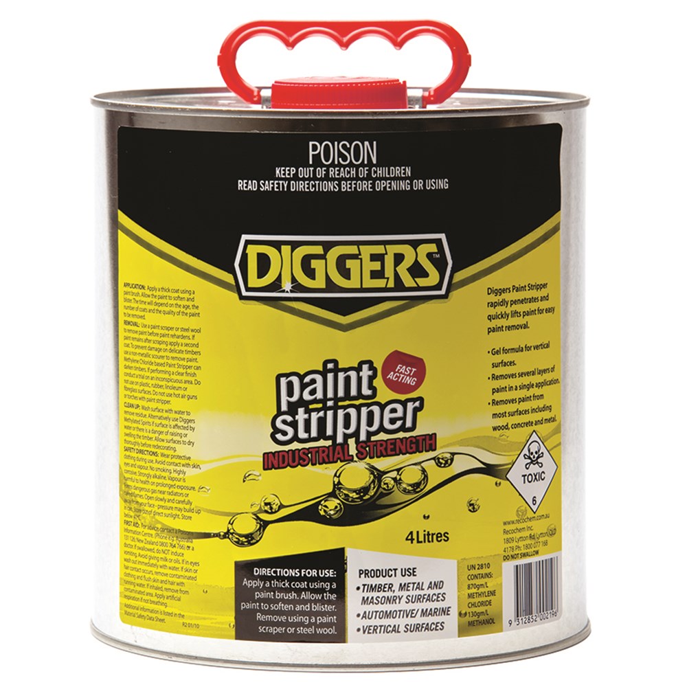 Suitable for household, industrial, automotive and marine applications. Timber, metal and masonry surfaces. Vertical surfaces. Gel formula for vertical surfaces. Deep penetration: removes serveral layers of paint in a single application. Diggers Paint Stripper is a powerful methylene chloride based paint stripper that rapidly penetrates and quickly lifts paint for Easy removal