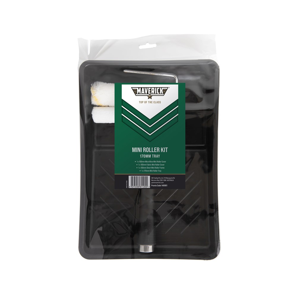 Includes a 170mm heavy duty tray, Short Handle Frame (100mm), 1 Microfibre Mini Roller Cover and 1 Fabric Mini Roller Cover.