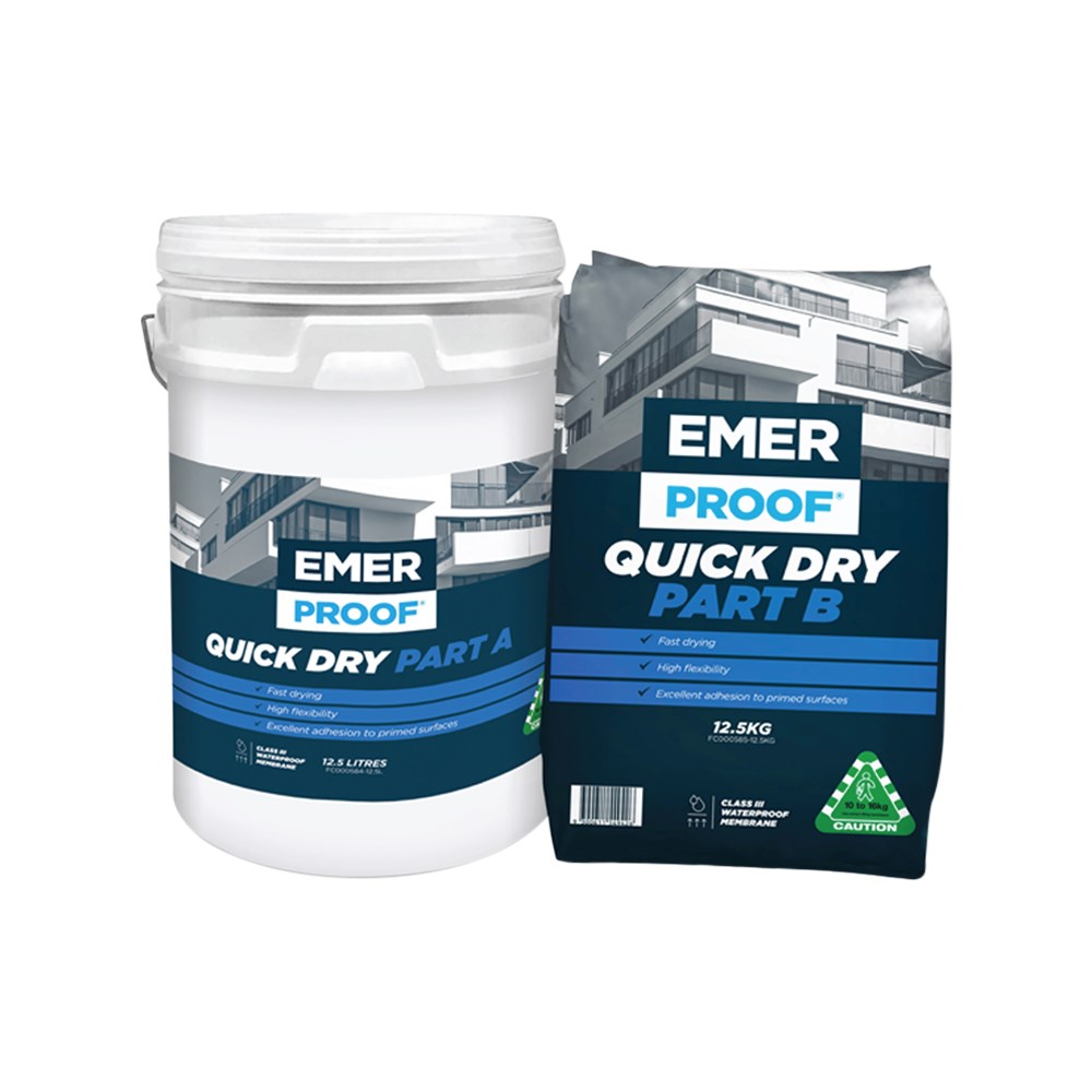 Emer-Proof Quick Dry is a water based, fast drying, flexible two component, polymer modified cementitious waterproofing membrane designed for podiums, terraces, balconies, and deck areas under toppings, tiles and other protected environments. It may also be used for foot trafficable exposed roof top membranes and foot trafficable exposed balcony decks when overcoated with Emer-Proof Top Coat. Quick Dry offers excellent adhesion properties over many primed building surfaces once correctly primed and prepared. Must be used with Part A, purchased separately.
