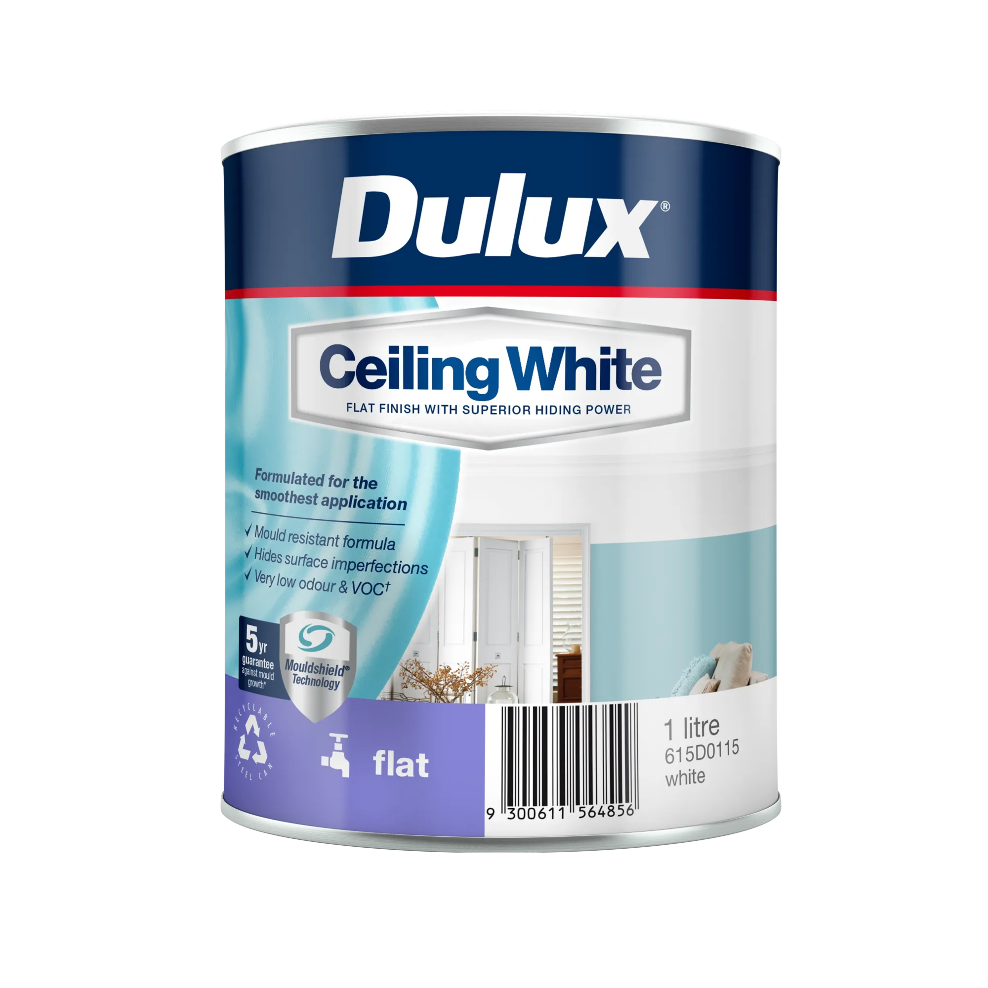 Dulux Ceiling White offers smooth application and a flat finish, making it easier than ever to transform all interior ceilings. With its exceptional coverage and superior hiding power, it effortlessly conceals surface imperfections. Equipped with a 5-year guarantee against mould growth, Dulux Ceiling White is specially formulated to achieve a long-lasting, quality result.