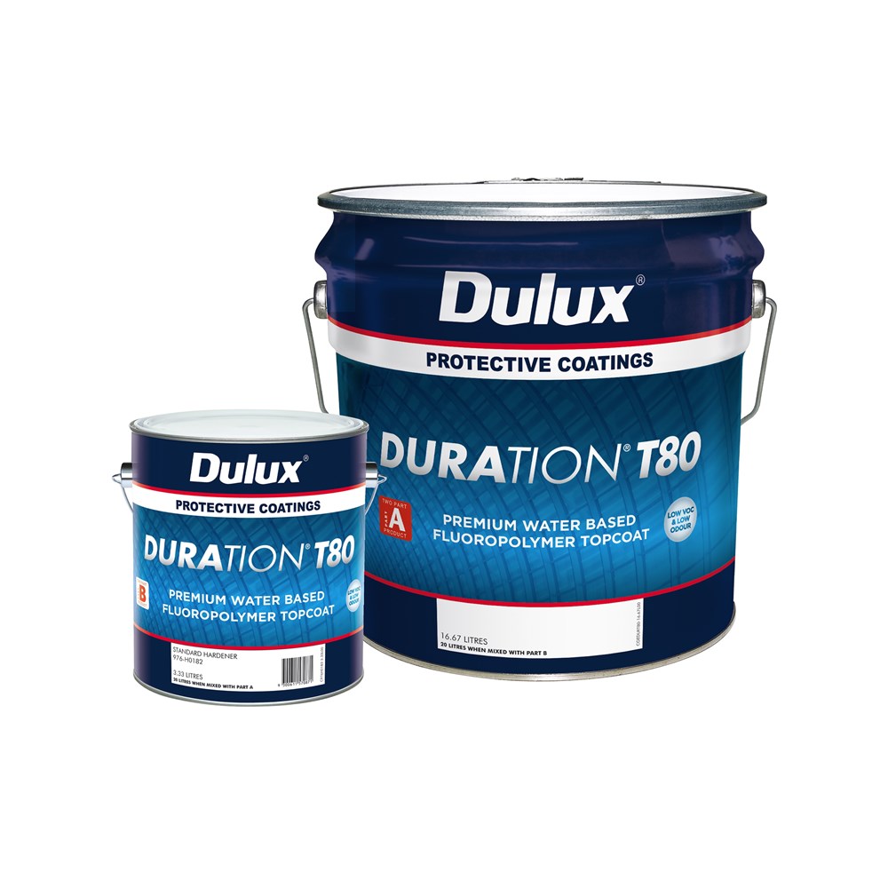 DURATION® T80 is a premium, two-component, water borne, fluorinated polymer finish that demonstrates excellent gloss and colour retention and is designed for applications where extended service periods are required. This is delivered via a system with a very low VOC content of only 23 grams per litre.
