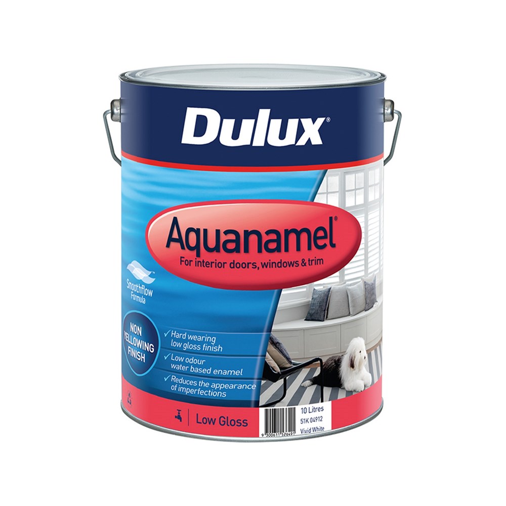 Dulux Aquanamel Low Gloss is a water based interior enamel that dries to a low gloss and hard wearing, chip resistant finish. Dulux Aquanamel Low Gloss has been designed to more closely match your low sheen or matt wall paint finish. Use Dulux Aquanamel Low Gloss to reduce the appearance of imperfections on your doors, windows & trim.