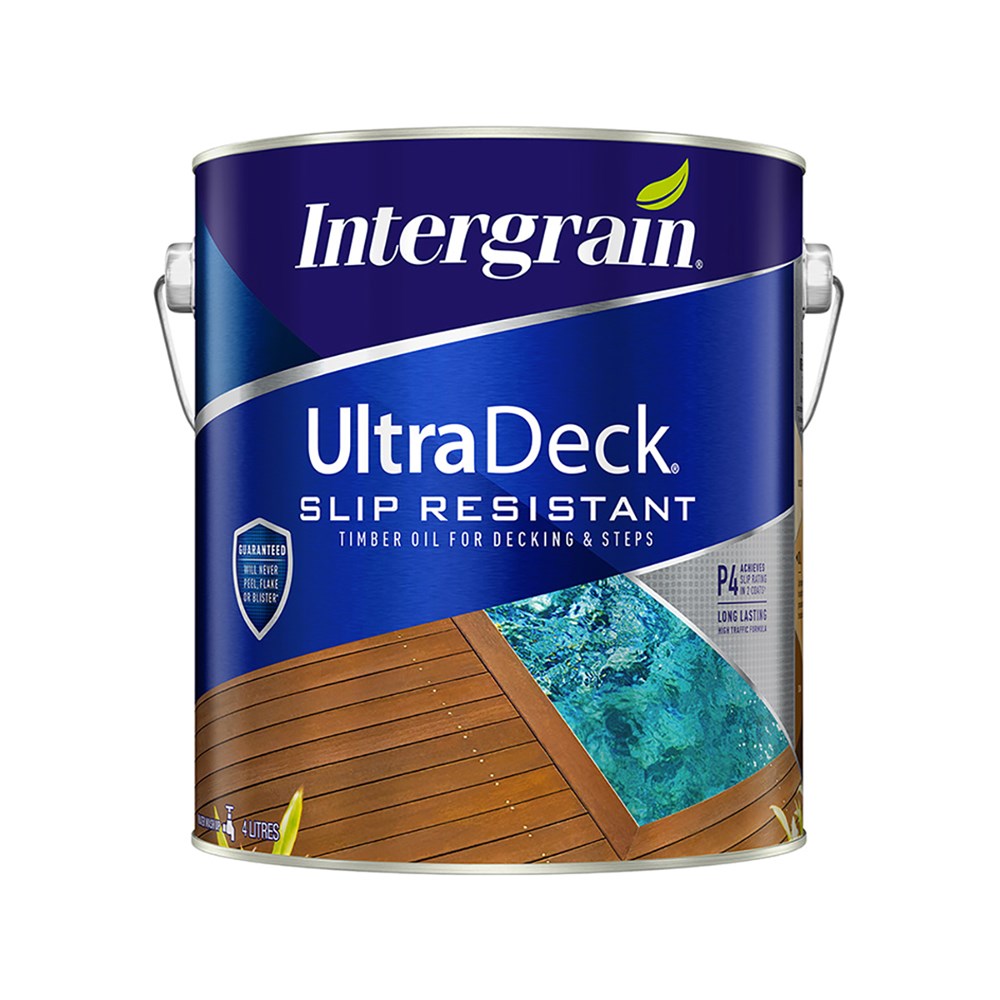 Intergrain UltraDeck Slip Resistant is a long-lasting, matt water-based coating for decking and exterior timber. UltraDeck Slip Resistant contains added Intergrain UltraGrip for a subtle textured finish that increases the slip resistance of exterior timber, it is recommended for stairs, walkways and around pools.
