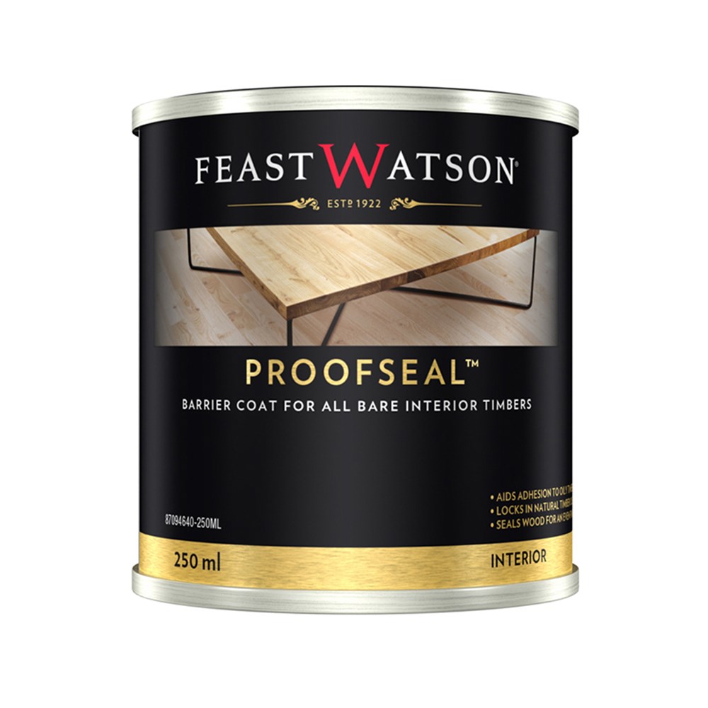 A penetrating sealer that locks in timbers tannin and oils, preventing issues with discolouration and adhesion caused by natural oils leaching over time. Proofseal reduces the tendency for lighter coloured timbers to darken once they are top coated. It is ideal for sealing naturally oily timbers such as Spotted Gum, Brush Box and Tallowwood. Proofseal can be overcoated with Feast Watson Clear Varnish, WeatherProof Varnish, FloorProof Pro, FloorSeal Oil, FloorClear, Floor Paint, Liming White Floor Finish, Black Japan Floor Finish and Crackle Lacquer. Note: Proofseal should NOT be used under Feast Watson Woodshield Oil, Decking Oil, Decking Stain, Outdoor Furniture Oil or Tung Oil.