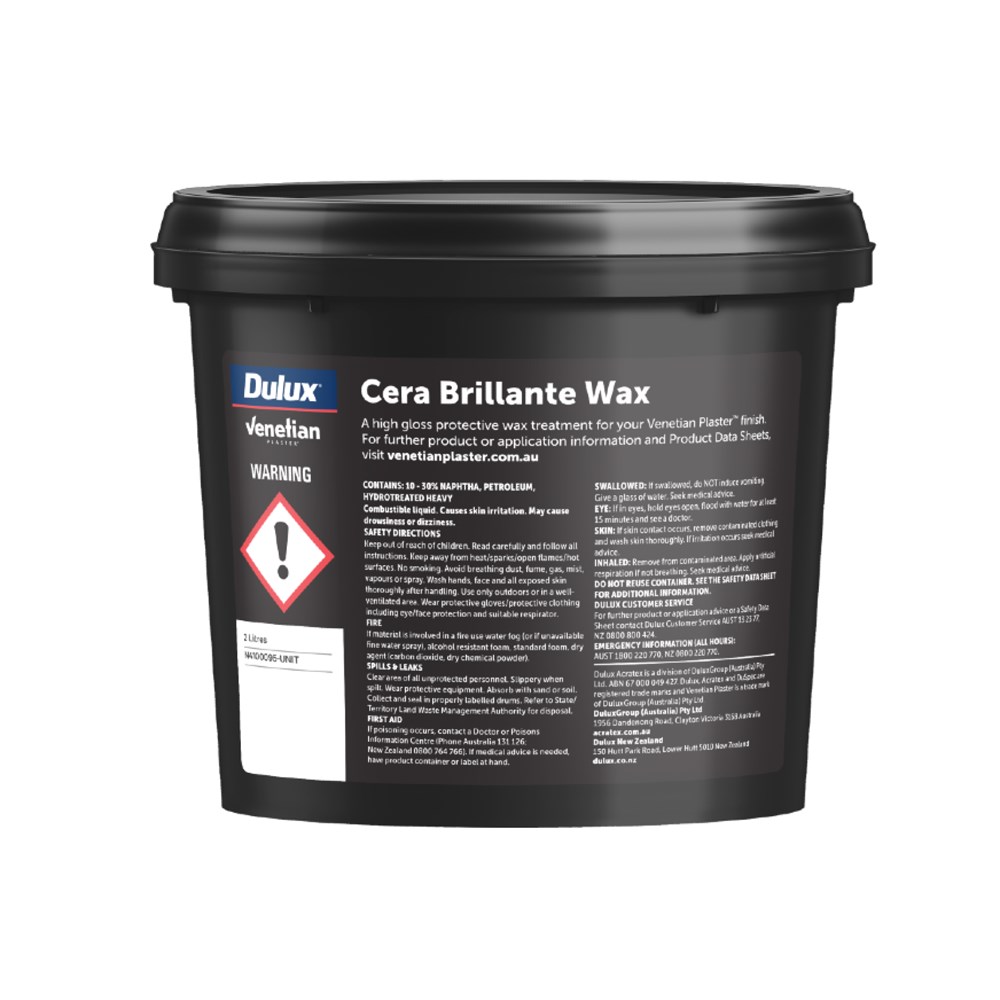 Dulux® Venetian® Plaster Cera Brilliante Wax is a water-based high gloss protective wax treatment foe interior surfaces that have been coated with Venetian Plaster. Popular on Polished Stucco and Marmorino Fine due to its high gloss, it is ideal for the preservation and protection of interior Venetian plaster finishes used in the restoration of old historical buildings such as churches, palaces or villas to create surfaces of elevated aesthetic value in all settings whether modern or classic halls, stairways, bathrooms, living rooms or to add a high gloss elegance to the most refined public places such as hotels, restaurants and shops. The highest gloss wax in our range.