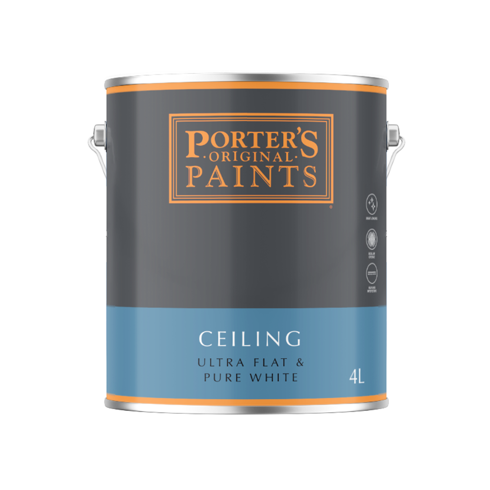 Made with concentrated titanium pigment, Porter’s Ceiling Flat provides ultimate hiding power. Its flat finish helps cover surface imperfections for that perfectly even finish, and the ultra white colour maximises light just where it is needed.