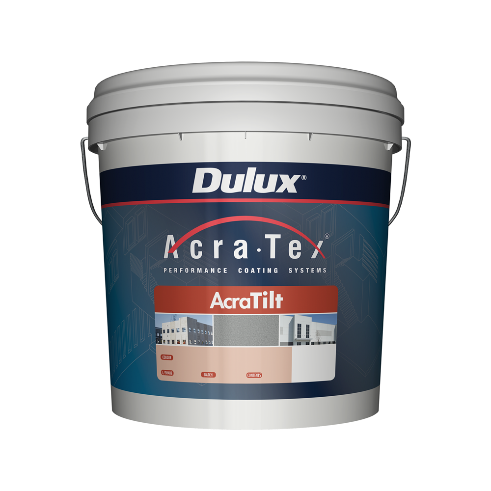 Dulux AcraTex AcraTilt is a pigmented, water based 100% acrylic coating designed as a self-priming top coat to overcoat Tilt Up Concrete. It upgrades the overall coating system durability and ensures greater colour consistency, especially over large areas. It reduces dirt accumulation, mold and algae growth, pollution and chemical attack – especially on high profile texture coatings. Available in Low Sheen and has a light roller stippled pattern.