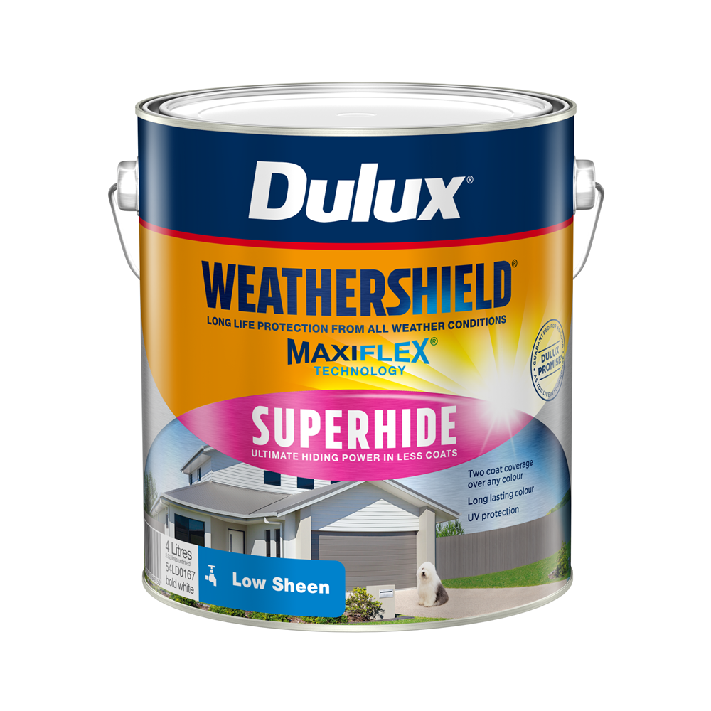 Dulux Weathershield® Super Hide provides ultimate hiding power due to concentrated levels of titanium pigment. It is specially designed to provide a tough, hard-wearing finish that provides protection from all weather conditions. Formulated with MaxiFlex® Technology to expand and contract with the surface, Dulux guarantees Weathershield® won't peel, flake or blister for as long as you live in your home.