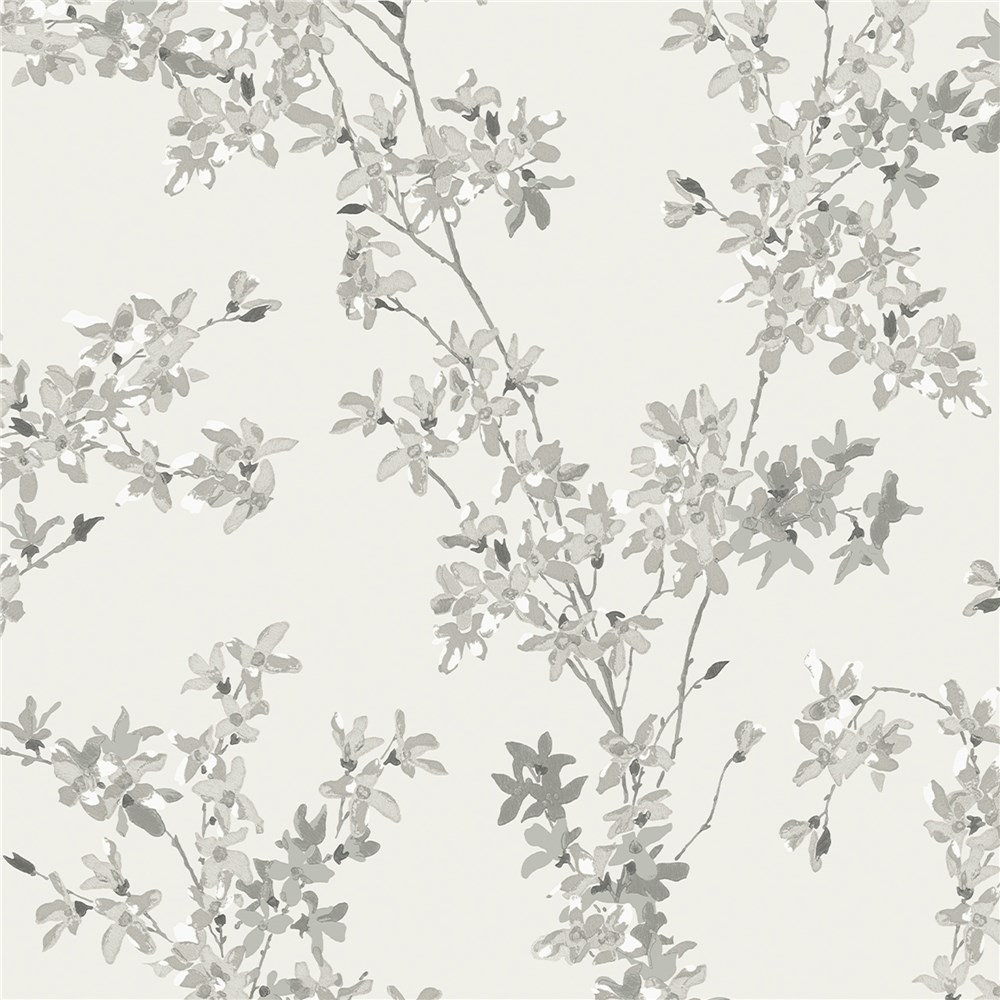 An off white background showcases this lovey natured inspired design of delicate steel grey Forsythia blossom.
