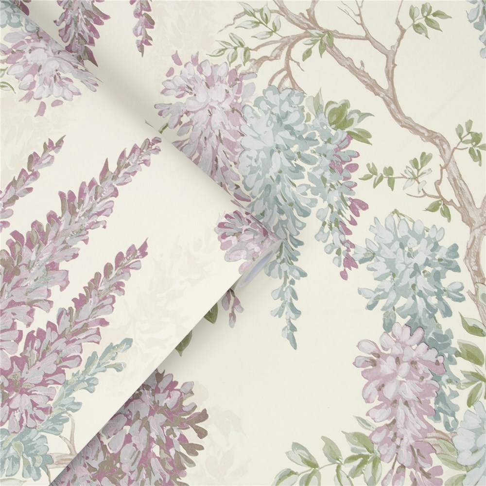 A fabulous redesign of Laura Ashley's popular Wisteria floral wallpaper featuring a trailing design of heavily laden Wisteria branches in soft shades of duck egg.