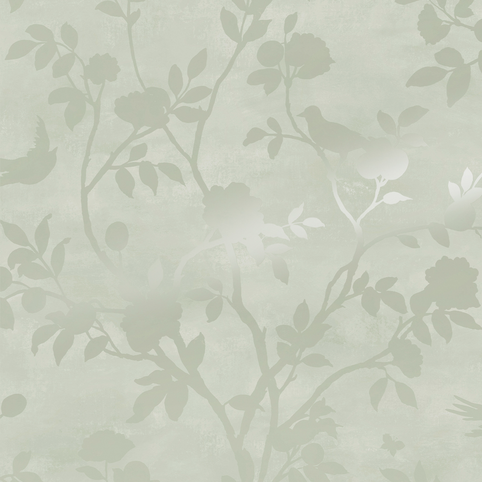 This stunning new sweetbrier trail design is brought to life in silhouette form with stunning mica highlights. The beautifully soft eau de nil background adds a French country charm feel.