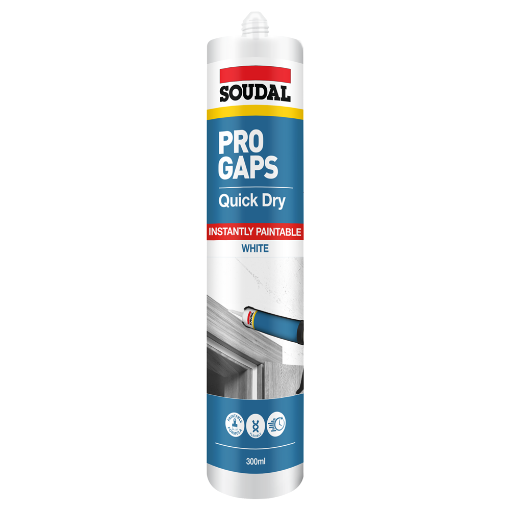 Soudal Pro Gaps Quick Dry is a one-component, gap filler where immediate painting is required with no waiting time. Due to its unique composition, it minimalises the risk for mud cracking or paint crazing, even with difficult highly-filled and covering paints. Immediately paintable with gloss, semi-gloss and low sheen paint. Flat and ceiling paints can be painted after only 10 minutes.